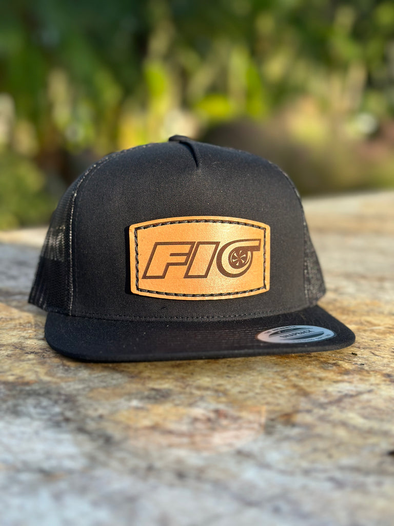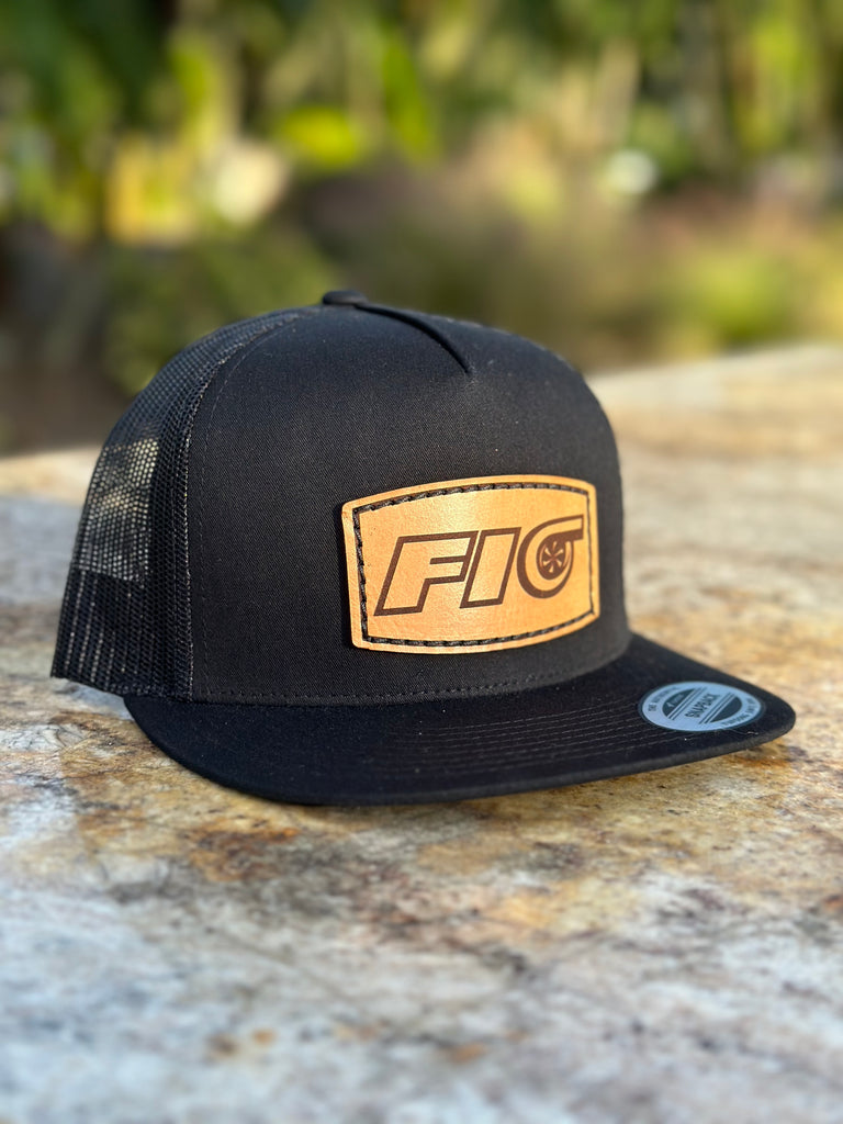 Black/Black Yupoong Adjustable 5 Panel Trucker Fio Flat Bill Hat with Patch